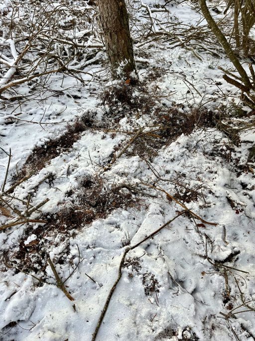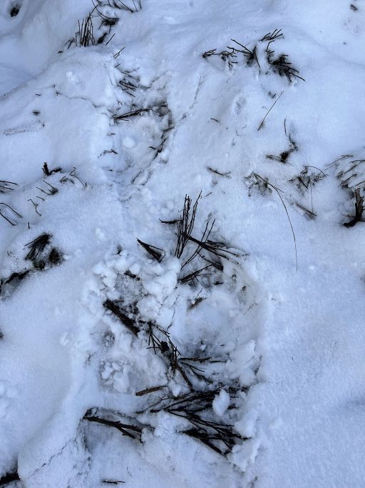 Cuando terminó la batida me fui a registrar los rastros y lo primero que hallé fue el frenazo que dio cuando se percató de mí presencia. Desde ahí las huellas sobre la nieve, que ese día helaba el ambiente y llegó a complicarnos el acceso a las posturas.
