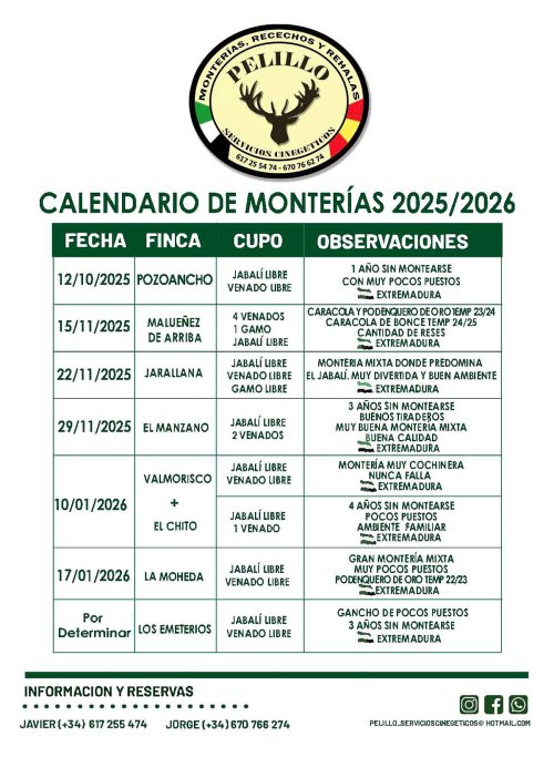 Calendario de Pelillo Servicios Cinegéticos 2025-2026 actualizado, son un total de ocho monterías, ya que Valdemorisco y El Chito, que son linderas, se cazan el mismo día.
