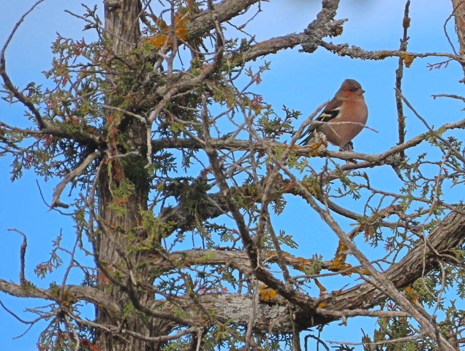Aunque me prometí a mí mismo que estando de montería no dedicarme a otros menesteres que no fueran los propios de la caza, no pude evitar fotografiar a los pinzones encaramados en las sabinas.