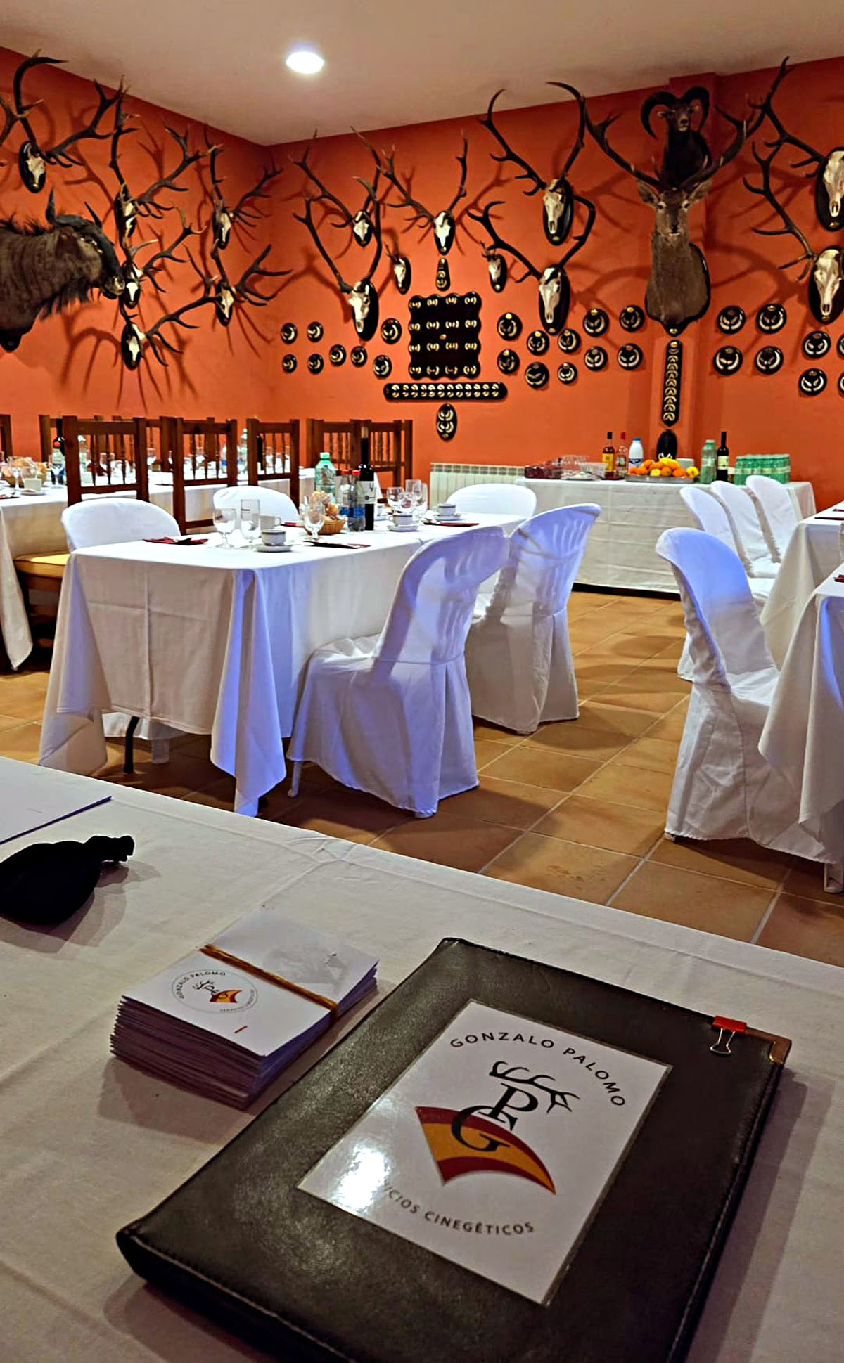 Desayuno y sorteo rápidos en el agradable salón de caza de la finca.